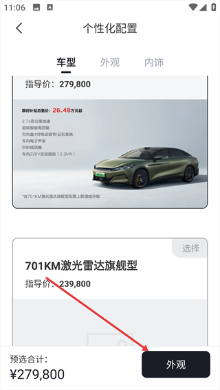 4、點擊下方【外觀】按鈕,可進(jìn)行該車型外觀樣式的選擇配置。
