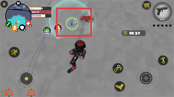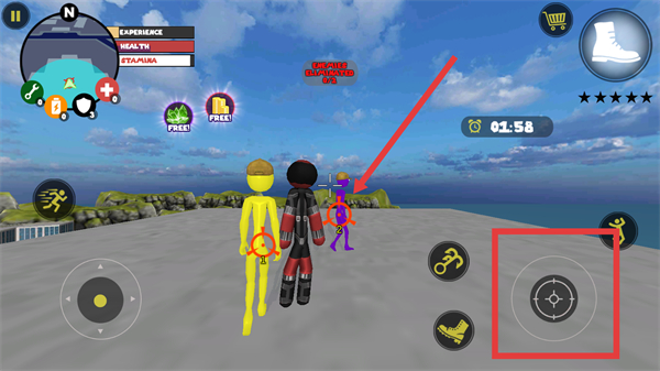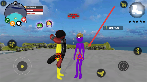 3、操作右側瞄準按鈕鎖定敵方角色,觸發超級踢技能,將目標角色擊飛出場景外完成清除。