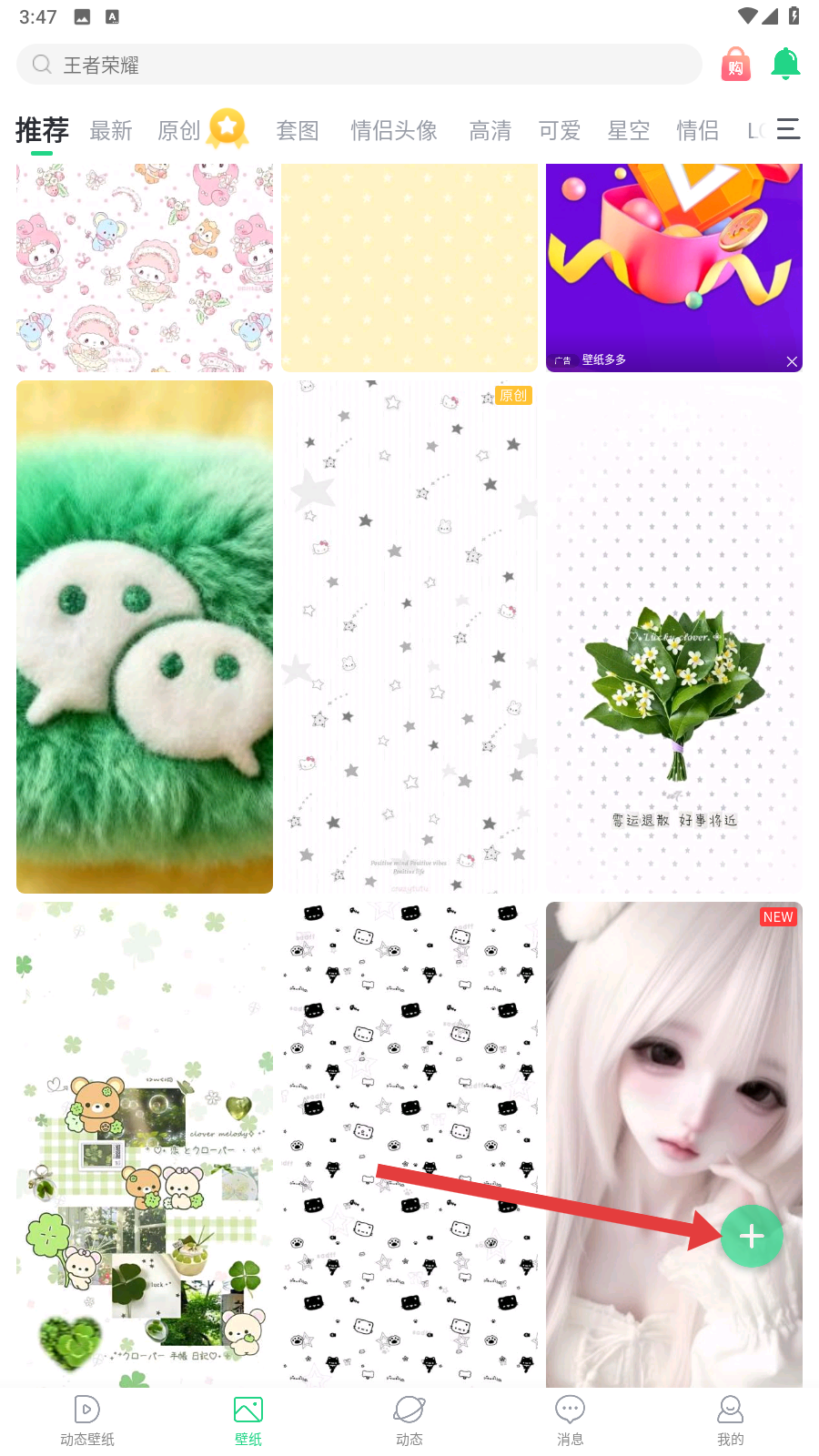 2、進(jìn)入壁紙頁后,點擊右下角綠色+號,彈出功能菜單,開啟原創(chuàng)上傳的旅程啦。