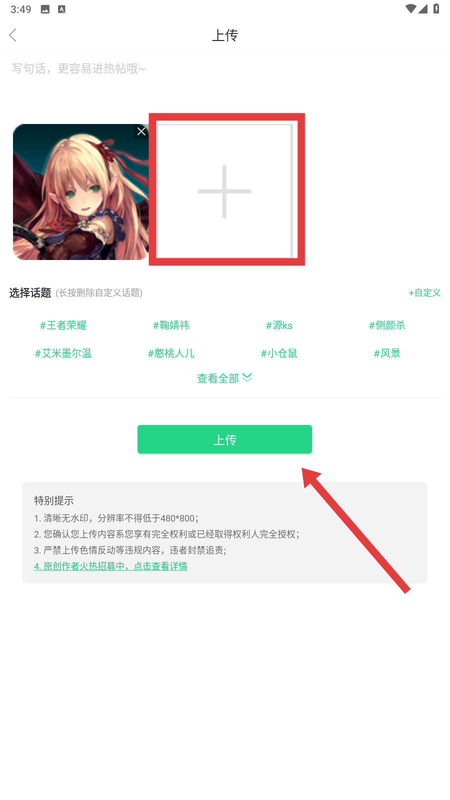 4、在上傳頁添加圖片,選好話題,點擊綠色【上傳】按鈕,你的原創(chuàng)壁紙就成功提交啦。