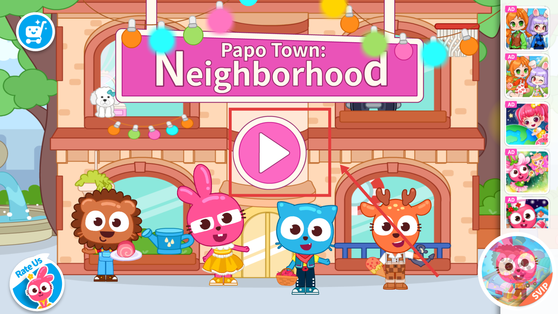 1、點擊界面中的粉色播放按鈕,即可進入游戲開始探索小鎮的趣味互動場景。