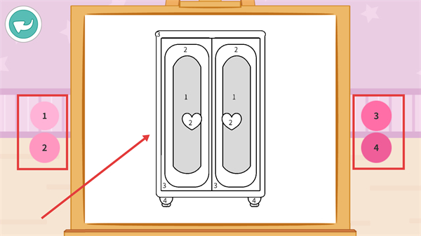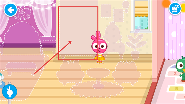 3、進入房間場景后,點擊紅框區域,與【兔子】角色一起完成房間布置的趣味任務。