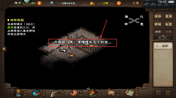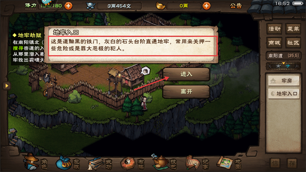 2、進入地牢后角色失去知覺,需從【地牢】場景退出,后續可前往【南陽渡】區域,重新規劃劫獄路線。