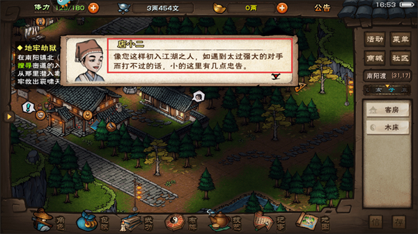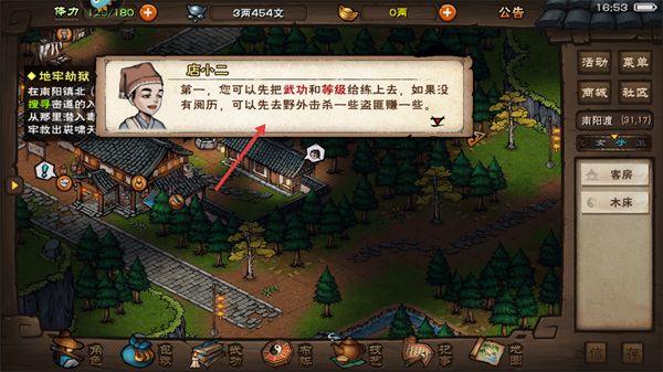 3、與【店小二】對話獲取忠告,初入江湖遇強敵時,可參考其建議提升自身實力,準備后續行動。