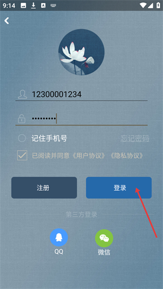 4、填寫完手機號與密碼、勾選協議后,點擊界面中的【登錄】按鈕完成登錄。