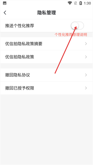 4、點擊【推送個性化推薦】的開關,開啟個性化推薦功能。