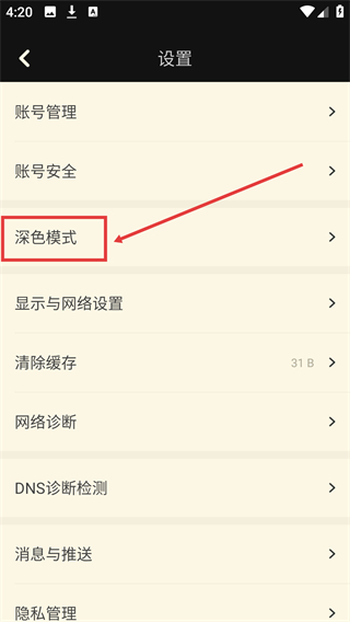 3、在【設置】頁面,選擇【深色模式】選項并點擊,進入深色模式的切換選擇界面。