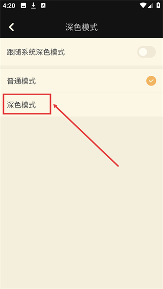 4、在【深色模式】頁面,選擇【深色模式】選項,即可將軟件界面切換為深色顯示風格。