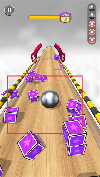2、持續控制【球體】前進,撞碎賽道上的【紫色方塊】堆,積累更多道具資源。
