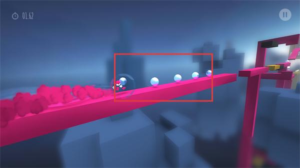 2、操控粉色角色在粉色跑道上奔跑,收集跑道上的【白球】道具,避開左側的粉色障礙。