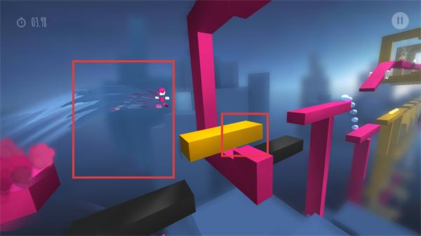 3、遇到粉黃拼接平臺時,切換角色為對應顏色,通過跳躍跨越平臺間隙,避免掉落水域。