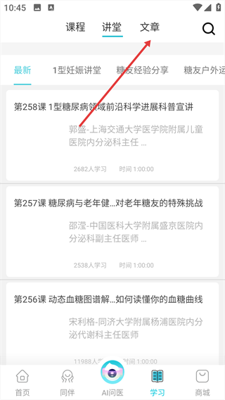 2、在學習頁面點擊頂部【文章】標簽,切換至文章頁面。