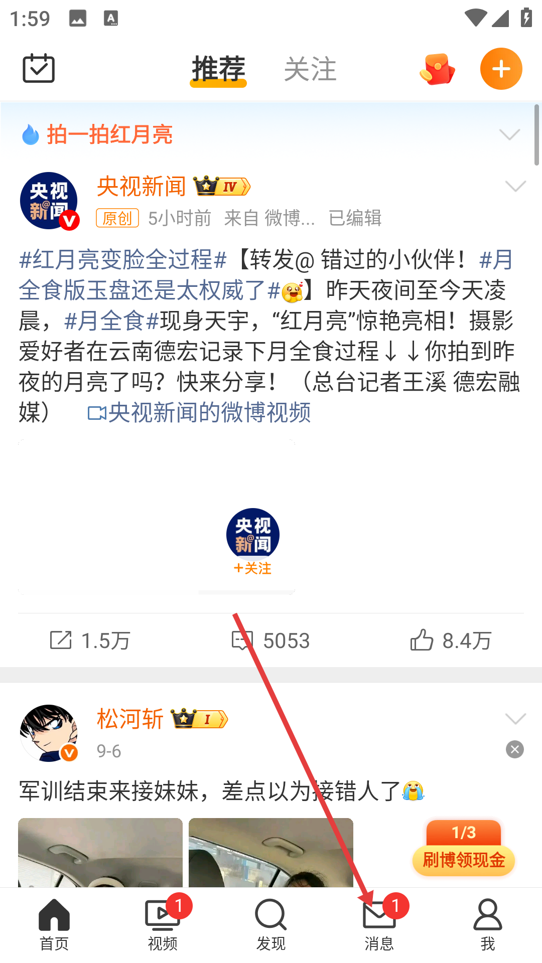 1、在微博首頁,點擊底部導航欄的【消息】,進入消息頁面。