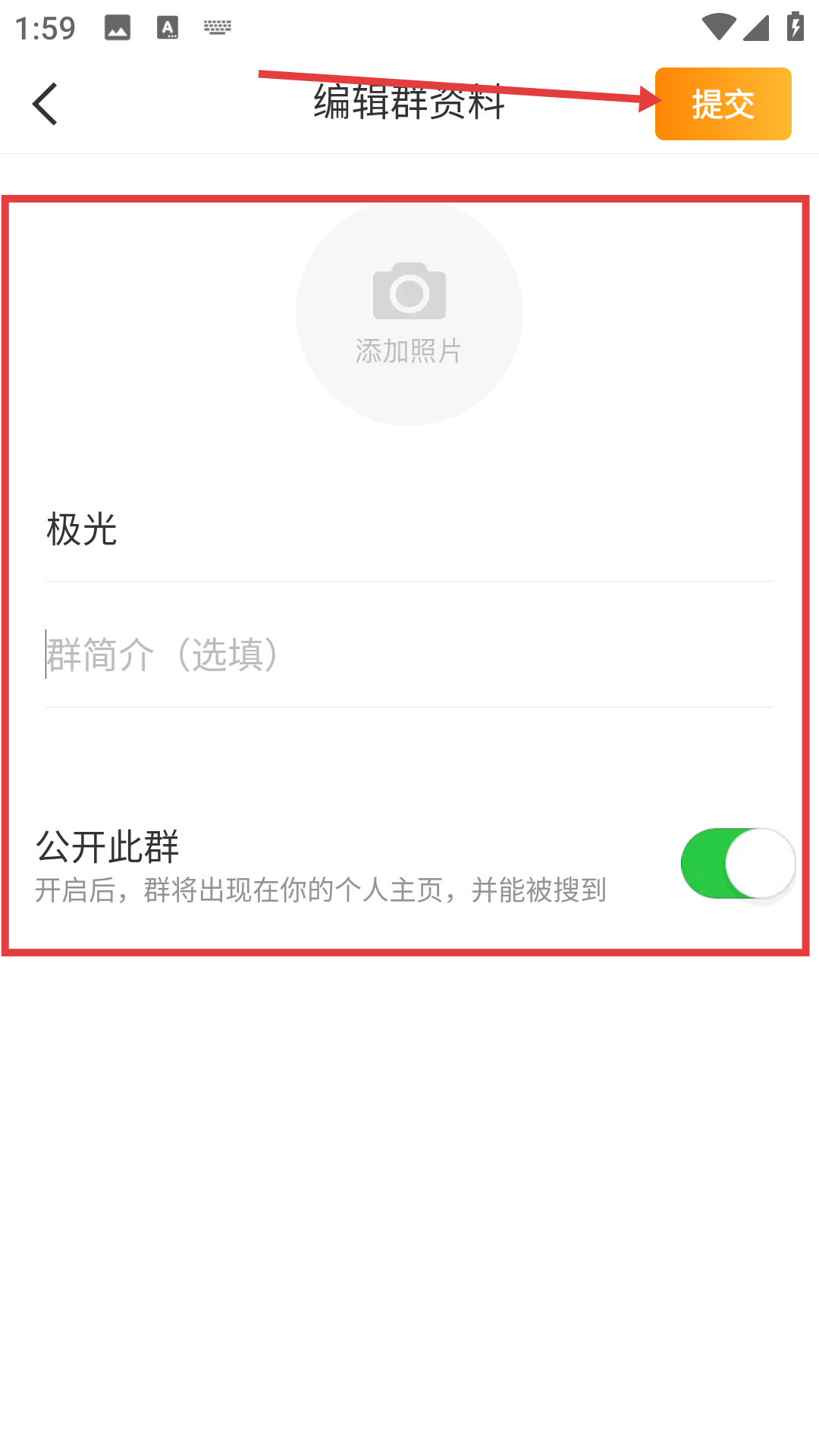 4、在編輯群資料頁,設置群名稱、群簡介等信息,點擊【提交】,完成群的創建。