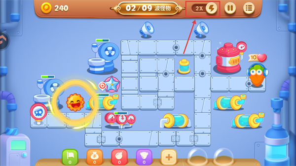2、戰斗時點擊界面上方的【2X】加速按鈕,可加快怪物波次推進速度,減少等待時間,讓戰斗進程更高效流暢。