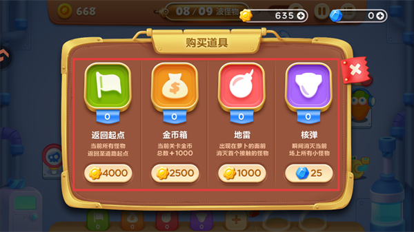 3、道具商店中,根據戰場情況購買【返回起點】-【金幣箱】-【地雷】-【核彈】道具,合理使用能助力快速通關。