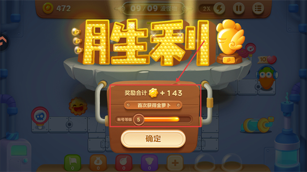 4、成功通關后可獲得【143】獎勵與【金蘿卜】成就,還能提升賬號等級,積累獎勵助力后續關卡挑戰。