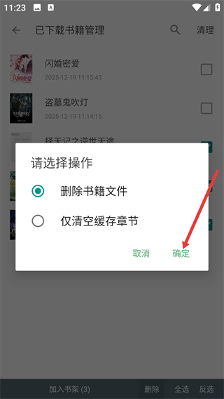 4、選擇所需操作類型(如“刪除書籍文件”、“僅清空緩存章節(jié)”),點(diǎn)擊“確定”完成刪除操作。