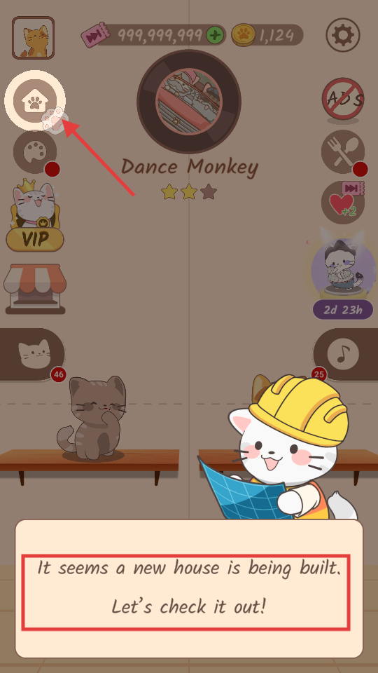 1、進入新房屋建造場景時,跟隨提示查看進度,解鎖與【DanceMonkey】關卡相關的貓咪互動趣味內容。
