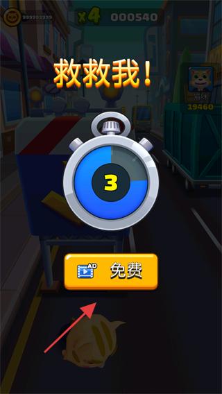 4、觸發“救救我!”提示時,點擊“免費”按鈕觀看廣告,即可復活小貓繼續跑酷,避免游戲結束。