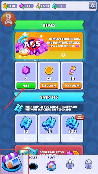 1、在【DEALS】界面點擊【FREE】按鈕領取道具,積累資源以便解鎖更多黑洞皮膚。