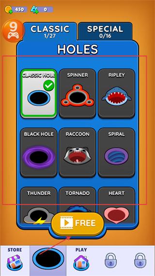 2、進入【HOLES】界面,選擇【CLASSIC】分類下的皮膚,點擊【FREE】解鎖新黑洞樣式。