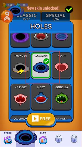3、解鎖后在【HOLES】界面選中目標皮膚(如【TORNADO】),即可更換當前黑洞的外觀。