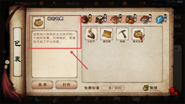 1、打開【粗布包裹】獲取【火折子】-【藏寶圖】-【鐵鎬】等物品,為后續(xù)探索與任務(wù)推進做好前期準備。