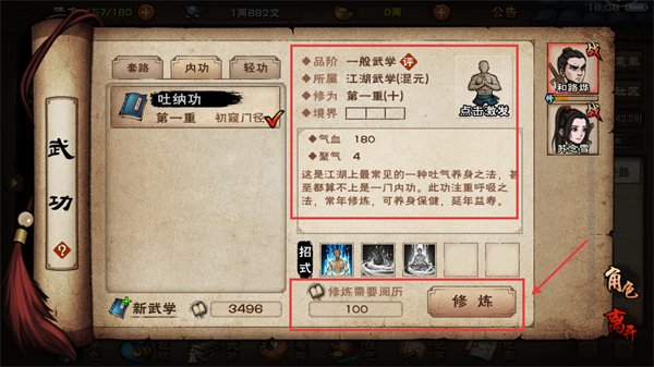 2、修煉【吐納功】提升氣血與聚氣屬性,增強角色基礎(chǔ)能力,助力應(yīng)對后續(xù)戰(zhàn)斗及劇情挑戰(zhàn)。