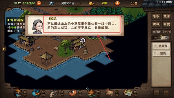 3、與【范氏】對話得知南陽鎮(zhèn)東莊村有對小兩口,可前往該地打聽相關(guān)線索推進任務(wù)。