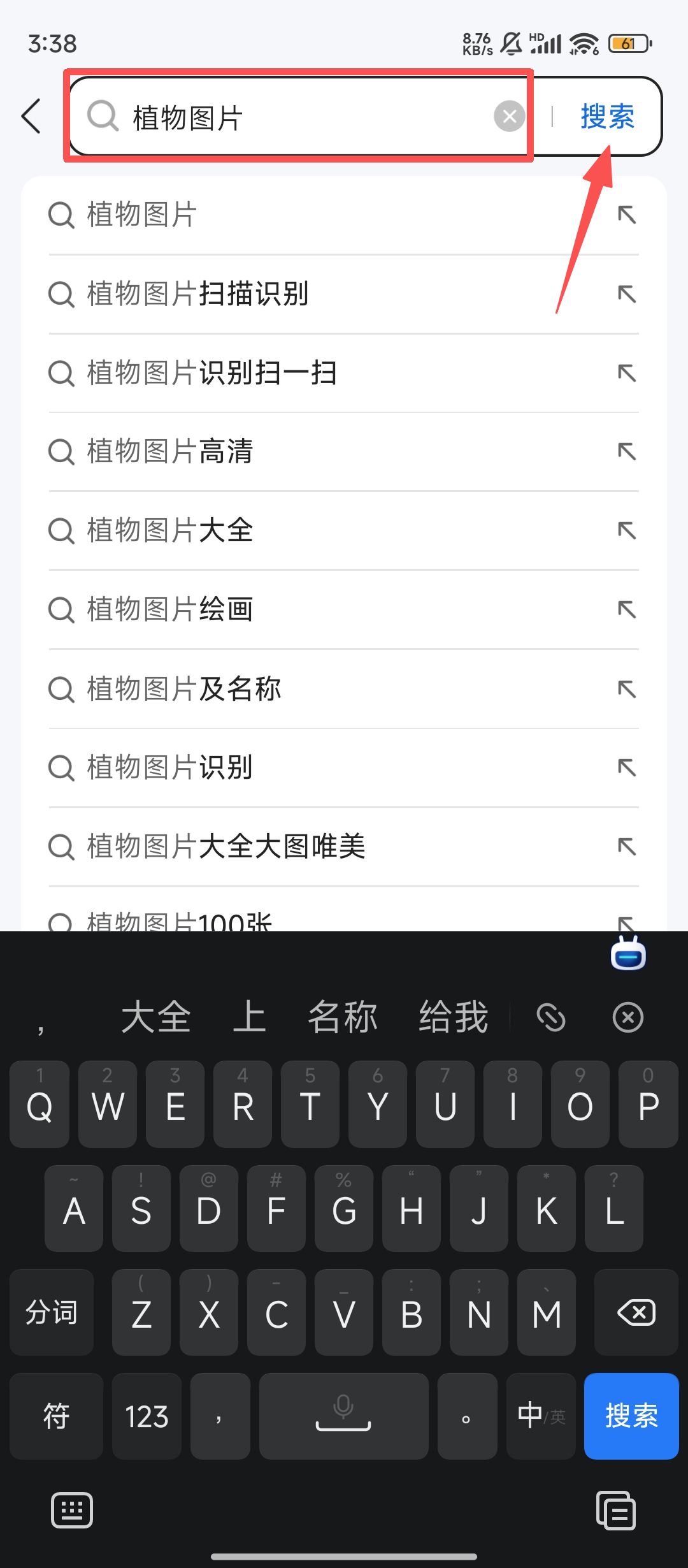 2、在搜索框里輸入【植物圖片】這類(lèi)關(guān)鍵詞,輸完后點(diǎn)擊右側(cè)【搜索】按鈕,會(huì)出現(xiàn)相關(guān)搜索建議。