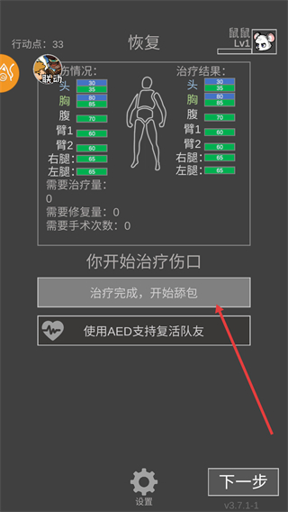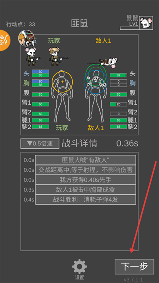 3、戰斗界面,對戰匪鼠1獲先手優勢,擊中胸部取勝,點擊【下一步】完成戰斗結算。