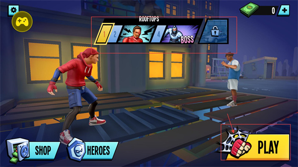 1、在關(guān)卡選擇界面點(diǎn)擊【PLAY】進(jìn)入“ROOFTOPS”關(guān)卡,該關(guān)卡包含多個(gè)普通關(guān)卡與BOSS戰(zhàn),需依次推進(jìn)解鎖后續(xù)內(nèi)容。