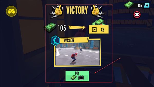 4、在勝利后可獲得貨幣獎(jiǎng)勵(lì),點(diǎn)擊【BUY】可消耗100貨幣解鎖新技能(如“EVASION”),提升角色的戰(zhàn)斗能力以應(yīng)對(duì)后續(xù)關(guān)卡。