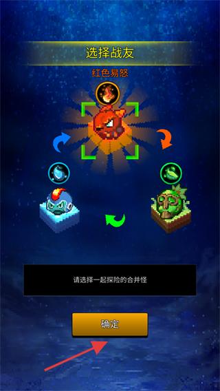 1、在【選擇戰友】界面,選定【紅色爆裂】等怪物后,點擊【確定】按鈕進入冒險合并環節。