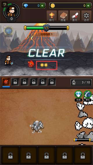 4、關卡通關后顯示【CLEAR】,獲取金幣獎勵,同時怪物合成進度提升(如5/10)。