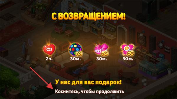 1、在回歸界面點擊【Коснитесь,чтобыпродолжить】繼續,領取【愛心-2ч】等回歸獎勵,進入消除關卡。