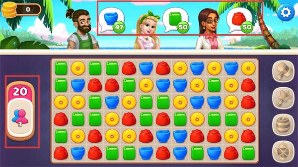 2、進入消除關卡,目標是收集【杯子-47】【盒子-50】【紅球-50】,剩余【20】步,開始消除對應元素。