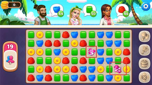 3、消除相同元素觸發特效,【杯子】剩余【44】、【紅球】剩余【46】,剩余步數變為【19】,持續推進目標。
