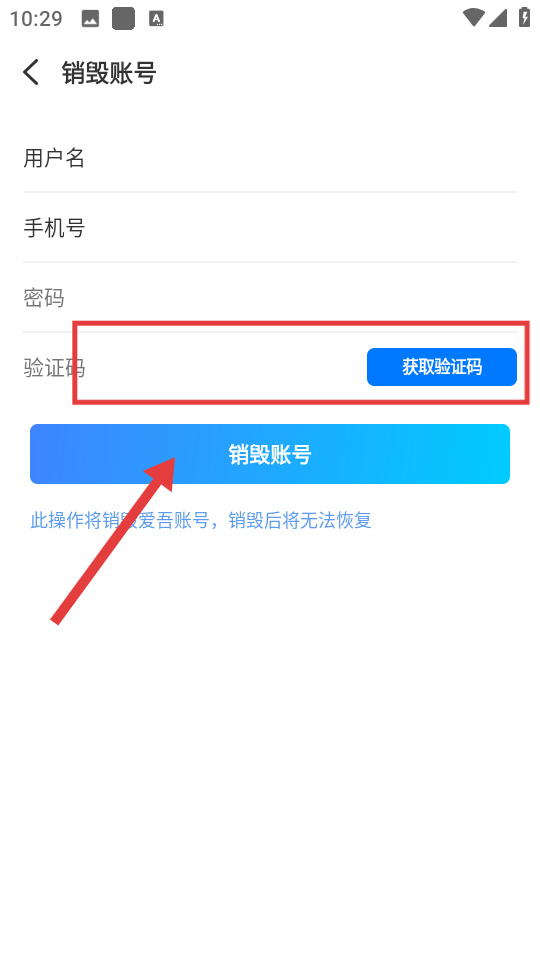 4、在銷毀賬號頁面,填寫密碼,獲取并輸入驗證碼后,點擊【銷毀賬號】按鈕,完成賬號注銷。