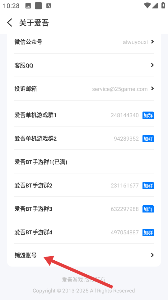 3、在【關于愛吾】頁面,點擊【銷毀賬號】選項,進入銷毀賬號頁面。