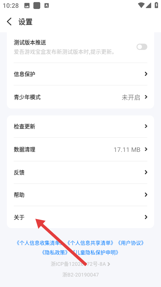 2、在設置頁面,點擊【關于】選項,進入關于相關頁面。