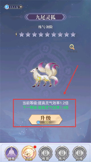 1、培養(yǎng)【九尾靈狐】時(shí),消耗【500】資源點(diǎn)擊升級(jí),可將靈氣效率從1.2倍提升至1.4倍,加速修煉進(jìn)度。