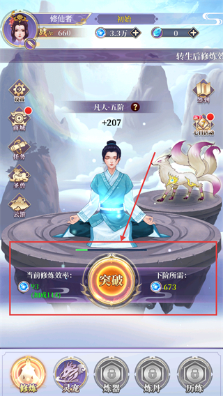2、處于【凡人-五階】時(shí),點(diǎn)擊【突破】按鈕提升修煉效率,積累足夠資源滿(mǎn)足下階所需,推進(jìn)成長(zhǎng)。