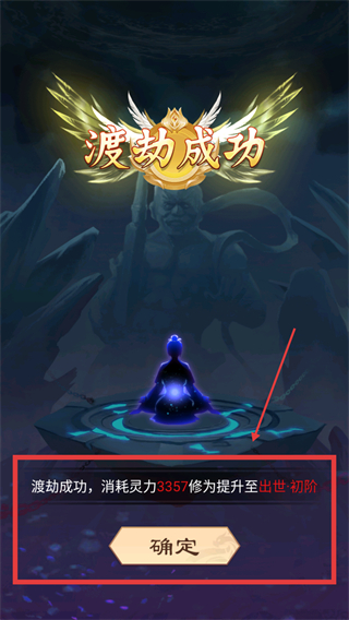 4、渡劫成功后,消耗【3357】靈力,修為提升至【出世-初階】,點(diǎn)擊確定繼續(xù)后續(xù)修煉進(jìn)程。