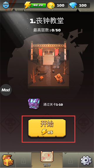 1、進(jìn)入【喪鐘教堂】關(guān)卡前確認(rèn)資源,點(diǎn)擊黃色開始按鈕消耗【閃電乘5】即可開啟冒險挑戰(zhàn)積累層數(shù)。