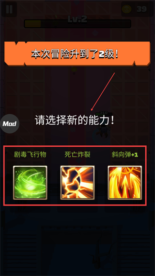4、升級到【2級】后出現(xiàn)能力選擇界面,從【劇毒飛行物】-【死亡炸裂】-【斜向彈+1】選其一增強(qiáng)戰(zhàn)斗能力。