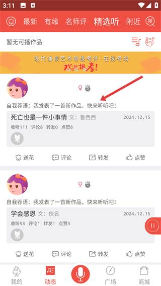3、親密誦友互動(dòng):支持用戶隨時(shí)隨地與其他誦友互動(dòng)交流,分享朗誦經(jīng)驗(yàn)、互相點(diǎn)評(píng)作品,形成良好的學(xué)習(xí)交流氛圍,增進(jìn)誦友之間的情誼。