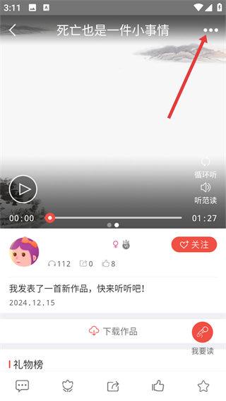 2、在作品詳情頁點(diǎn)擊右上角【三個(gè)點(diǎn)】,彈出功能選項(xiàng),為轉(zhuǎn)發(fā)操作做好準(zhǔn)備啦。