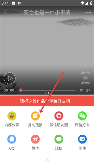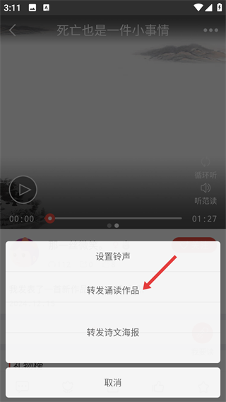 3、在彈出的選項(xiàng)中選擇【轉(zhuǎn)發(fā)誦讀作品】,進(jìn)入分享渠道選擇界面呢。